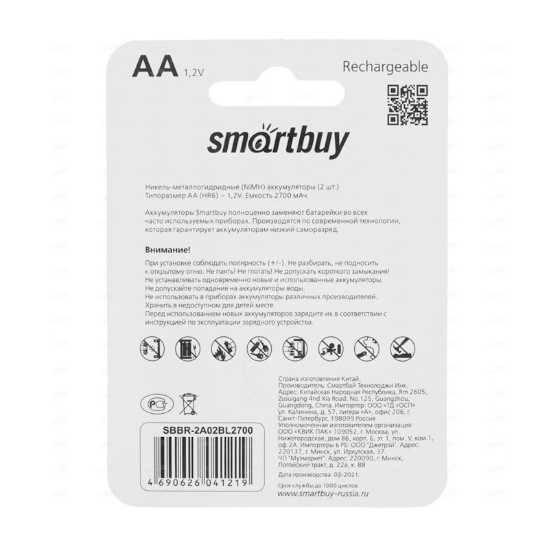 Аккумулятор Ni-Mh Smartbuy, тип АА, 1,2 В, 2,7А*ч (уп. 2 шт.)