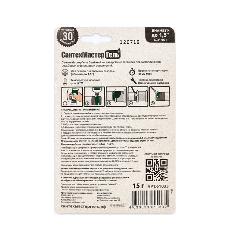 Анаэробный клей-герметик Сантехмастергель до 1 1/2" зеленый, 15 гр