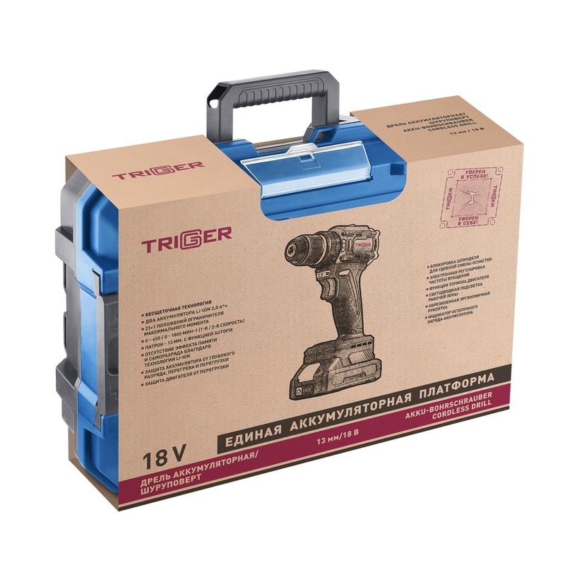 Дрель-шуруповерт Trigger 20121, бесщеточная, 2 аккумулятора Li-ion (2Ач), 18V, 13 мм, 58 Нм, кейс в Подольске