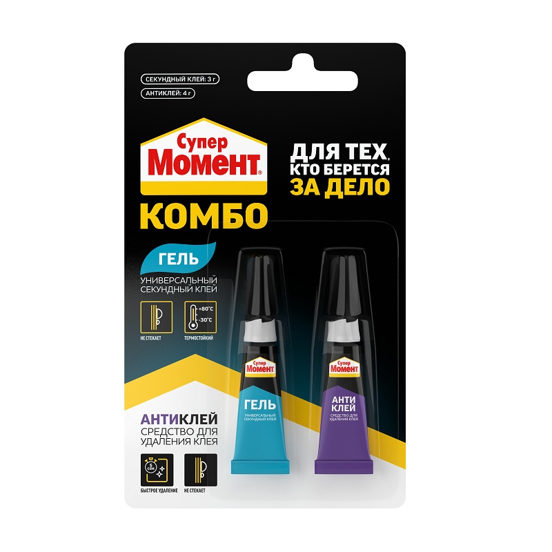 Набор СуперМомент Комбо подходит как для быстрого склеивания различных материалов, так и для безопасного удаления остатков клея: быстро склеил, быстро очистил руки. Идеален для использования на вертикальных поверхностях: не стекает и не капает.