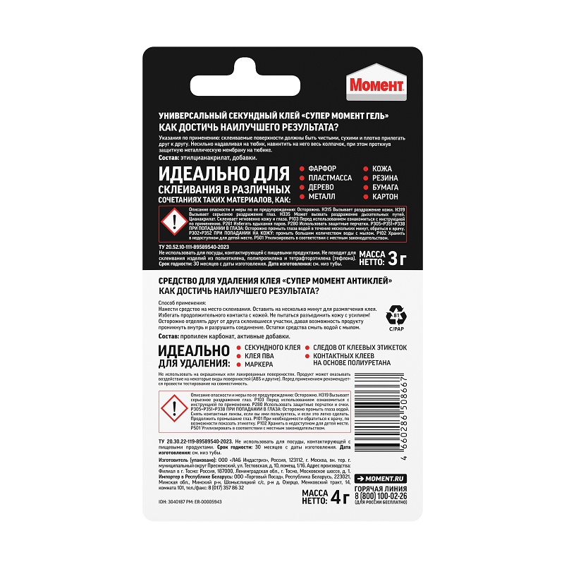 • Супер Момент Антиклей (4 г) подходит для легкого и быстрого очищения поверхностей от большинства видов клея, а также освобождения склеившихся пальцев.