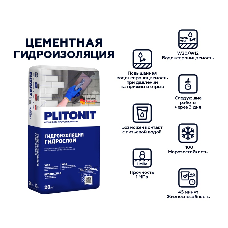 Гидроизоляция цементная обмазочная Plitonit Гидрослой, 20 кг