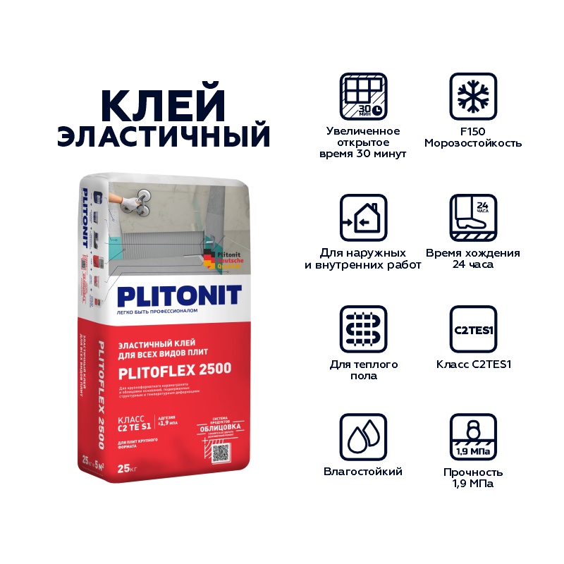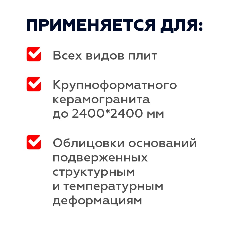 Предназначен для всех видов плит. Клей для плитки, натурального и искусственного камня, керамики, керамогранита, клинкера, крупноформатного керамогранита и облицовки оснований, подверженных структурным и температурным деформациям. Класс C2TES1. Подходит для облицовки внутри и снаружи помещения. Подходит для облицовки сложных поверхностей: бетона, железобетон, ячеистый бетон, кирпич, гипсокартон, цементные, известково-цементные и гипсовые штукатурки, сложные и деформирующиеся основания и элементы конструкций, таких как ЦСП, ДСП.