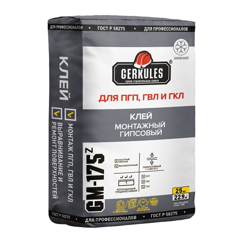 Клей монтажный гипсовый для ПГП и ГКЛ Gerkules GM-175Z зимний, 25 кг