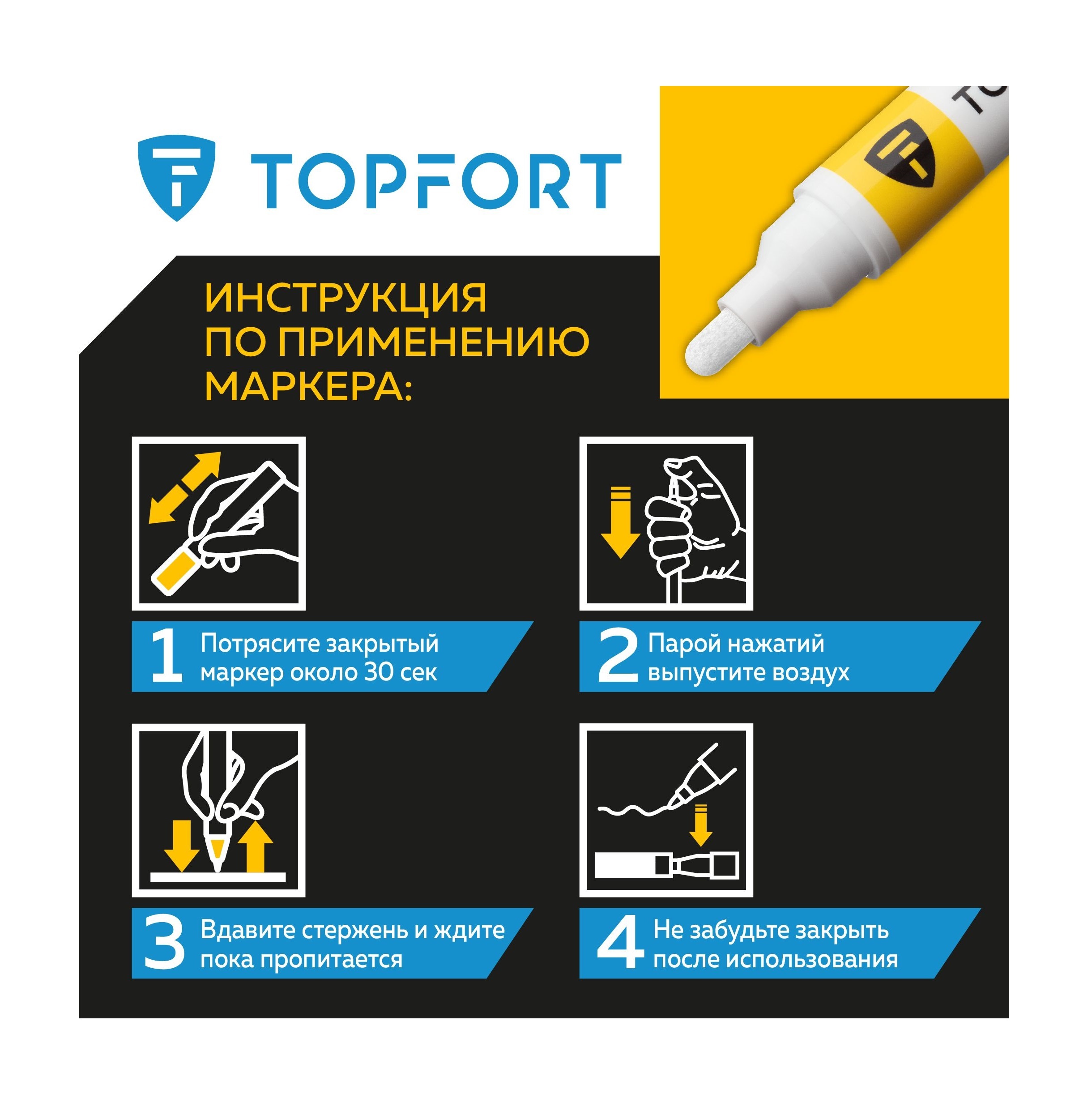 Предостережения: плотно закрывайте колпачок после применения, держать маркер вдали от источников тепла и воспламенения.