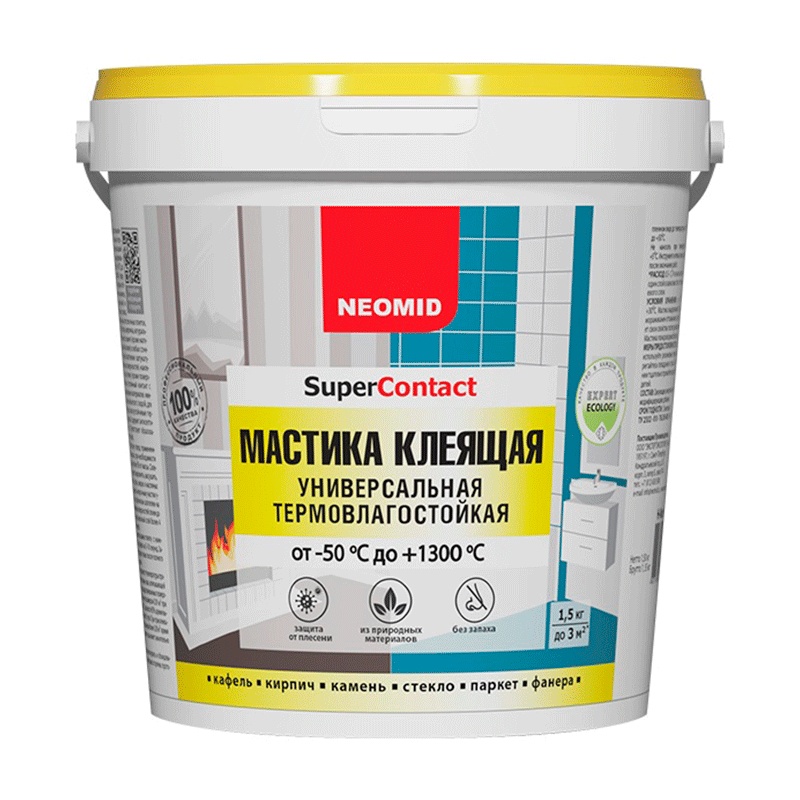 Мастика клеящая Neomid термостойкая универсальная предназначена для кладки и облицовки печей и каминов, склеивания различных поверхностей. Применяется для склеивания кафельной и метлахской плитки, стекла, пенополистирольных плит и плиток ПВХ, дерева, картона, бетона, кирпича, натурального и икусственного камня в любых сочетаниях, неглубокой шпатлевки оштукатуренных и бетонных поверхностей, наклеивания фанеры на стяжку (кроме поверхностей, имеющих постоянный контакт с водой).
