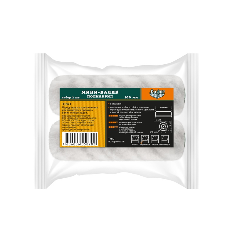 В строительном магазине Сатурн можно купить товар "Мини-валик Варяг 31873 полиакрил, ворс 12 мм, 100 мм (уп. 2 шт.)" по цене от 134 руб с доставкой за 4 часа по Подольску или оформить самовывоз.
