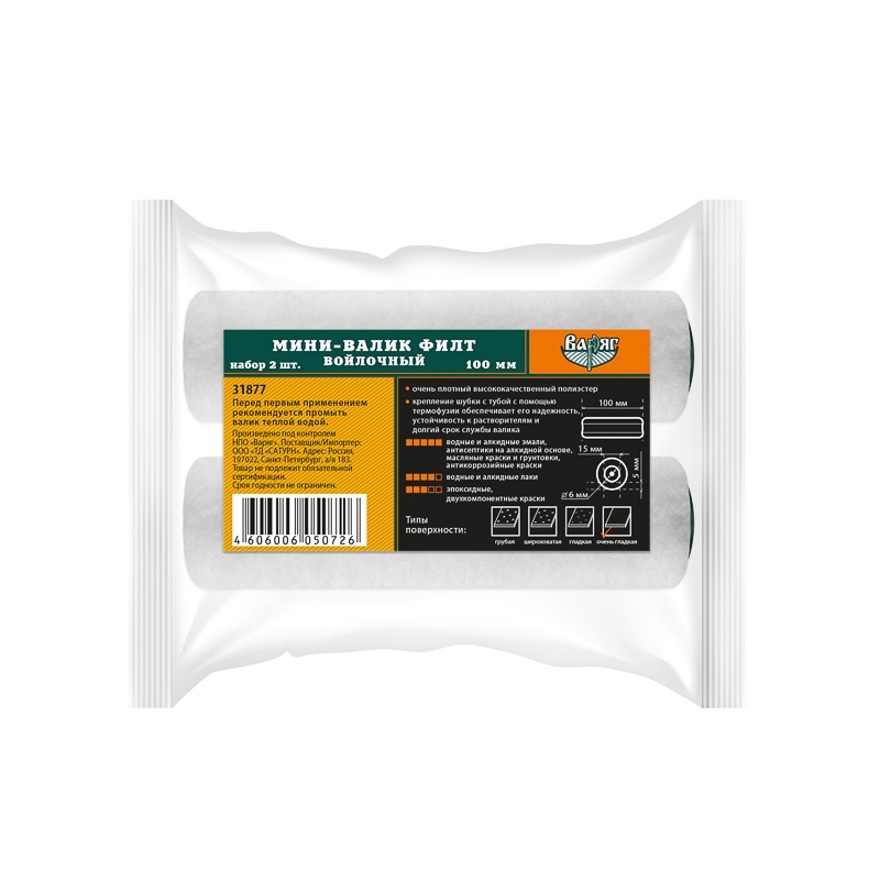 В строительном магазине Сатурн можно купить товар "Мини-валик Варяг 31877 войлочный, ворс 5 мм, 100 мм (уп. 2 шт.)" по цене от 134 руб с доставкой за 4 часа по Подольску или оформить самовывоз.