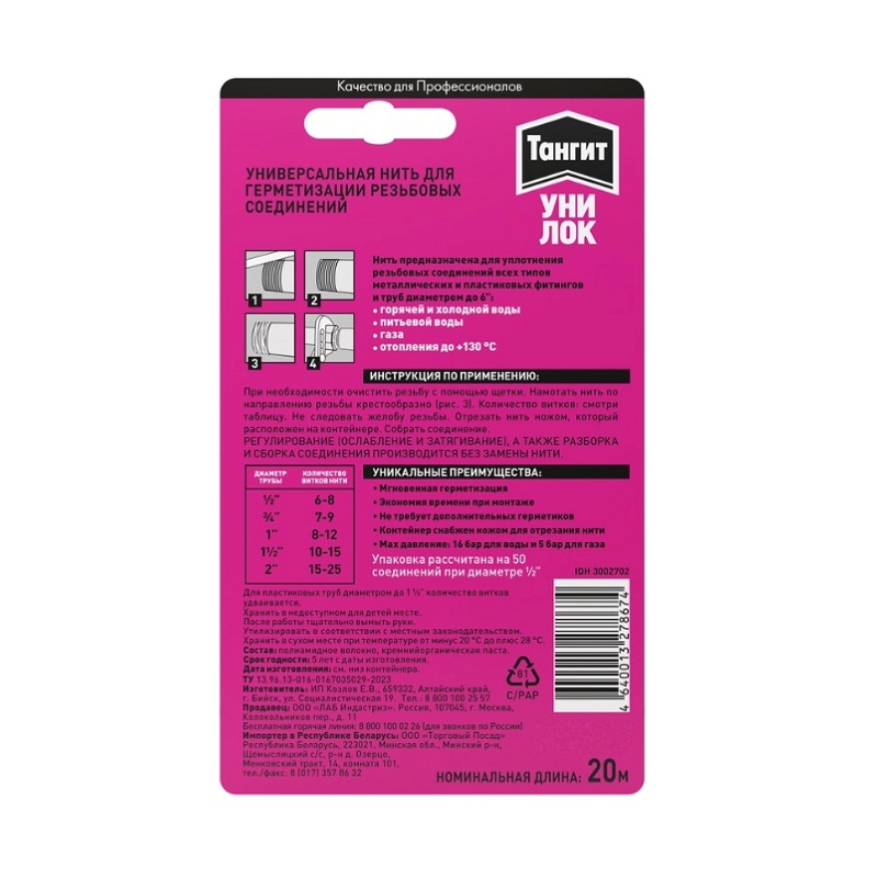 Нить для герметизации резьбовых соединений Тангит Uni-Lock, 20 м (блистер)