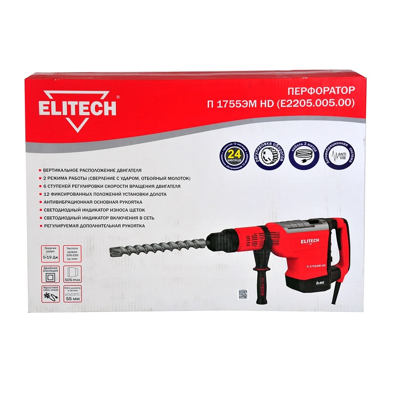 Перфоратор сетевой Elitech 1755ЭМ HD, SDS-мax 55 мм 1,7кВт 2 режима 19Дж, L кабеля=3м, кейс