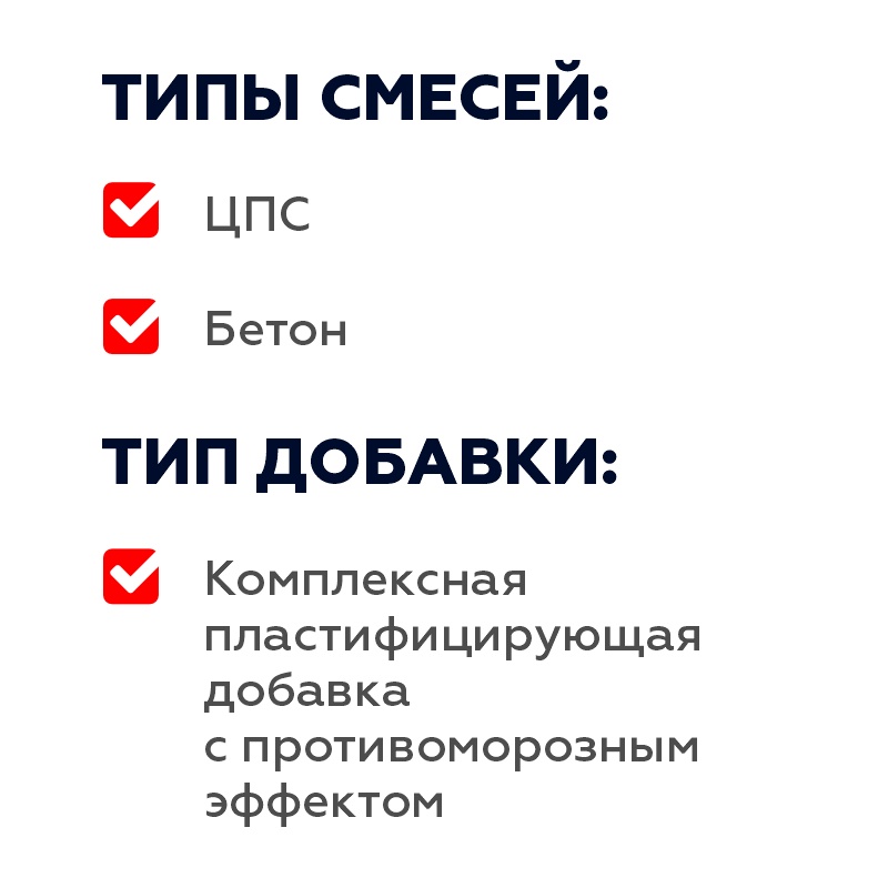 Предназначена для модификации свойств растворных и бетонных смесей. Обеспечивает твердение при температуре до -25°С при соблюдении правил зимнего бетонирования. Обладает пластифицирующим и стабилизирующим (снижает расслоение раствора) эффектом. Снижает трещинообразование. Не содержит веществ, агрессивных к бетону и раствору. При температурах от +20°С и выше ускоряет набор прочности бетонов и немодифицированных растворов. Добавку не допускается вводить при изготовлении железобетонных конструкций с напрягаемой арматурой, с ненапрягаемой арматурой диаметром 5 мм и менее.