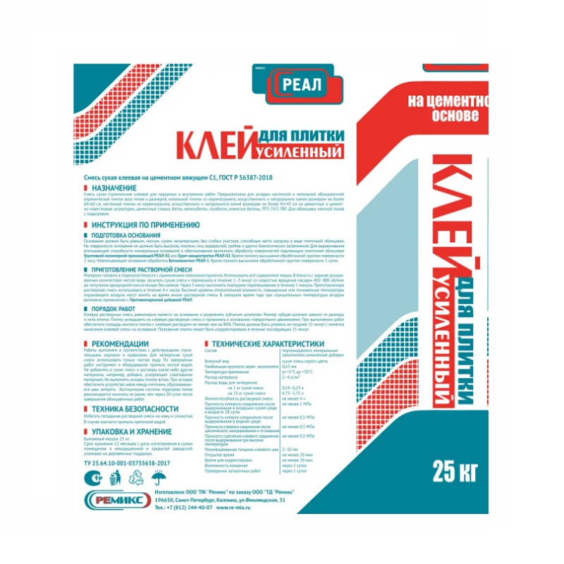 Клей для плитки Реал Усиленный (25 кг)