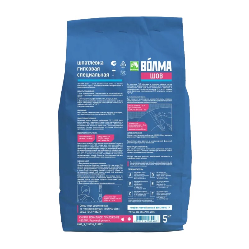 Шпаклевка гипсовая Волма Шов для заделки стыков ГКЛ, ГВЛ, 5 кг