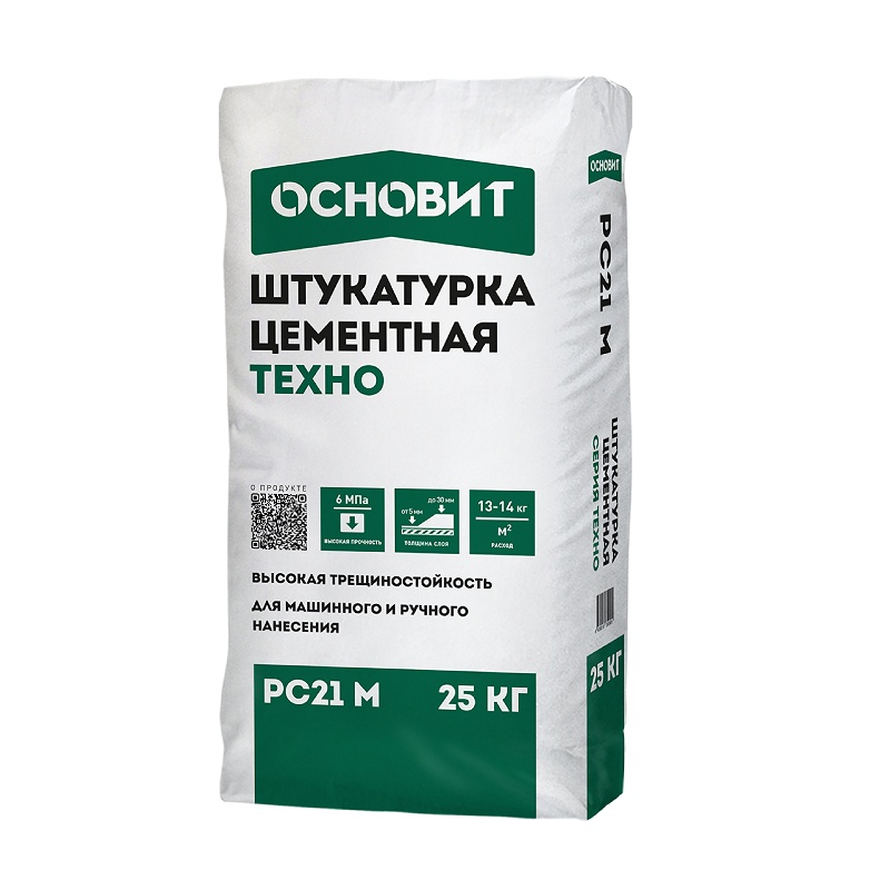 Штукатурка цементная Основит Техно PC21 M предназначена для выравнивания стен из бетона, кирпича, пено- и газобетона. Рекомендуется для отделки фасадов выше цокольной части и помещений с любой степенью влажности.