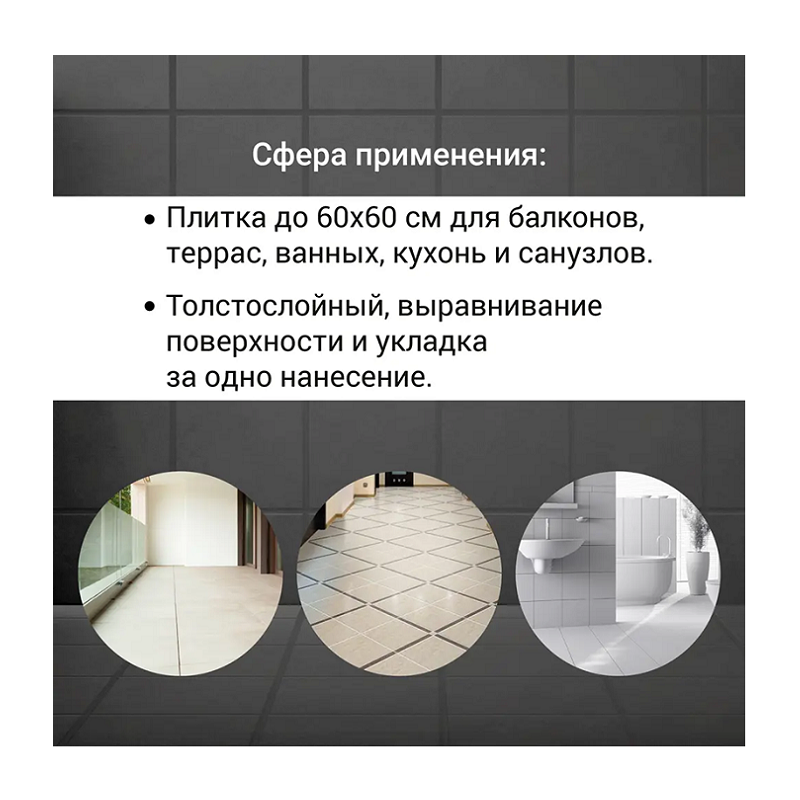 • Двухфункциональность: Способность одновременно выравнивать и приклеивать (слой до 15 мм) значительно ускоряет процесс укладки, экономя ваше время и усилия.