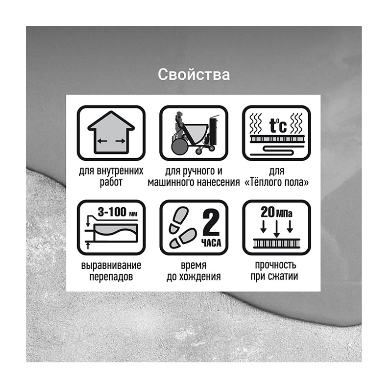 - Смесь: сухая напольная самовыравнивающаяся Рк5, В12,5 Вtb3,2 по ГОСТ 31358-2019.