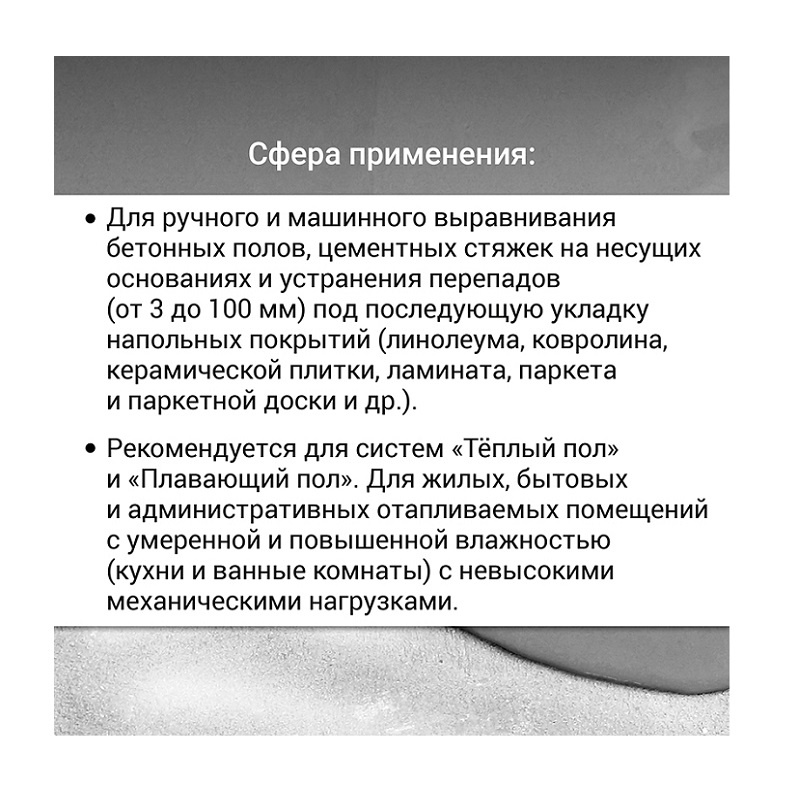 Наливной пол Unis Горизонт универсальный подходит для укладки на бетонные и цементно-песчаные недеформирующиеся основания, возраст которых составляет не менее 28 суток.