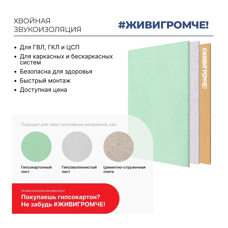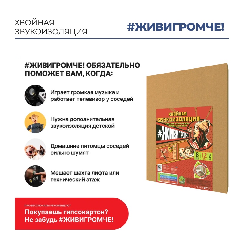 Используется в квартирах и домах, совместно с гипсокартоном и гипсоволокном, для монтажа разнообразных бескаркасных и каркасных систем звукоизоляции стен, перегородок, потолков и перекрытий с индексом Rw до 70 dB. Формирует высокоэффективный звукоизоляционный слой от 24 мм и выше при монтаже совместно с ГКЛ и (или) ГВЛ.